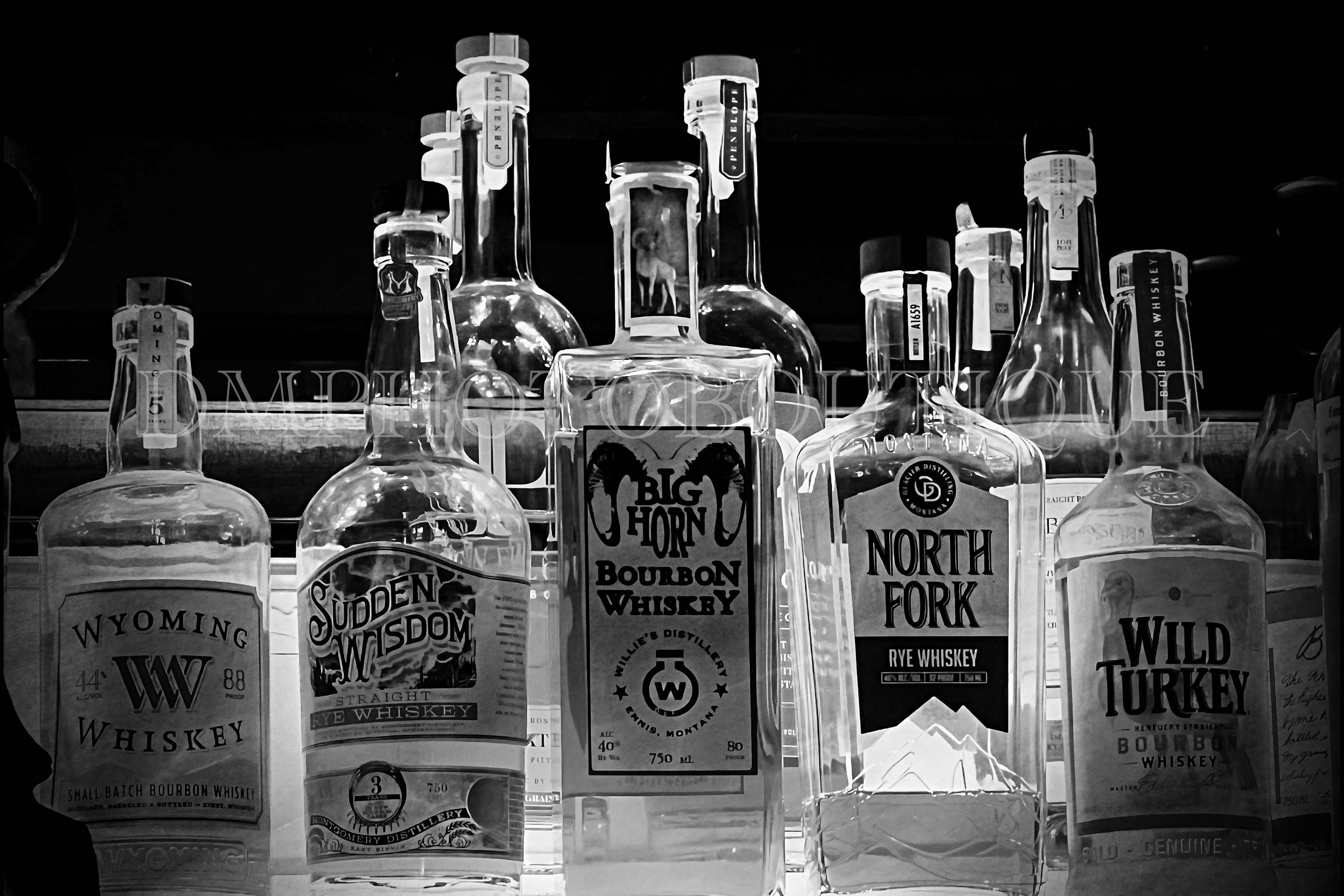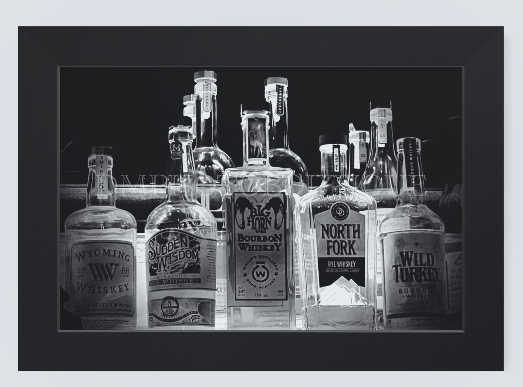 Great artwork for the whiskey lovers home bar! Photo is taken in a Montana Bar with several whiskey bottles backlit.