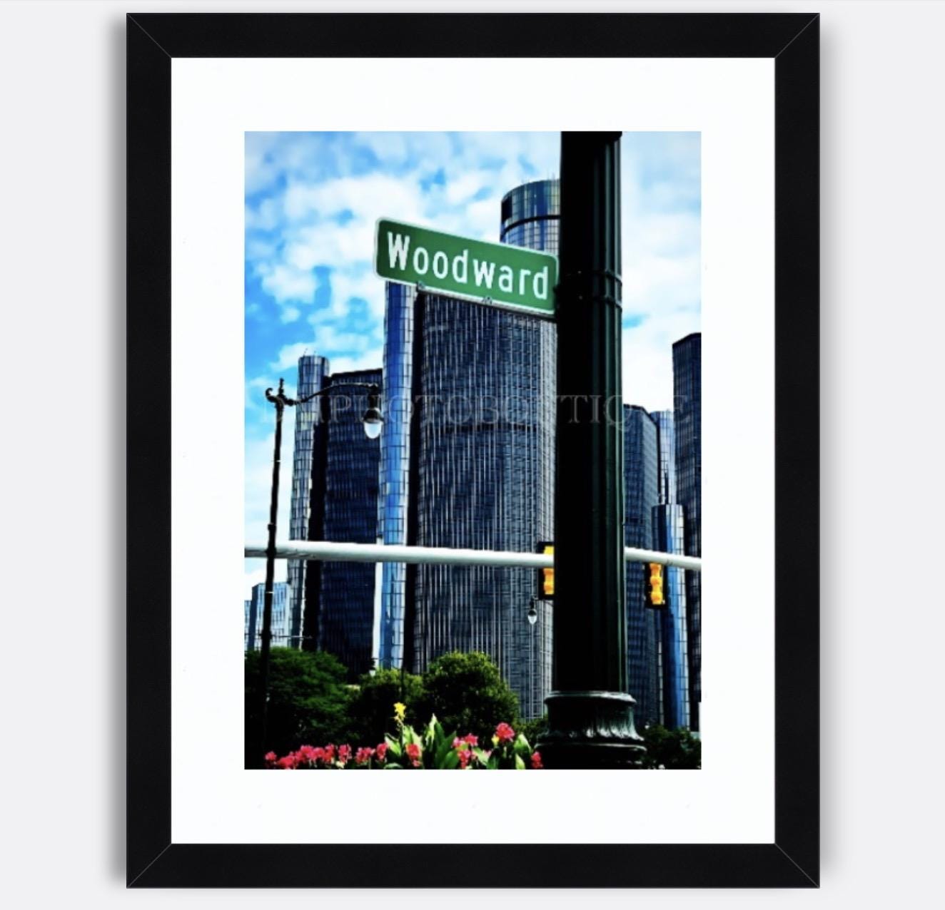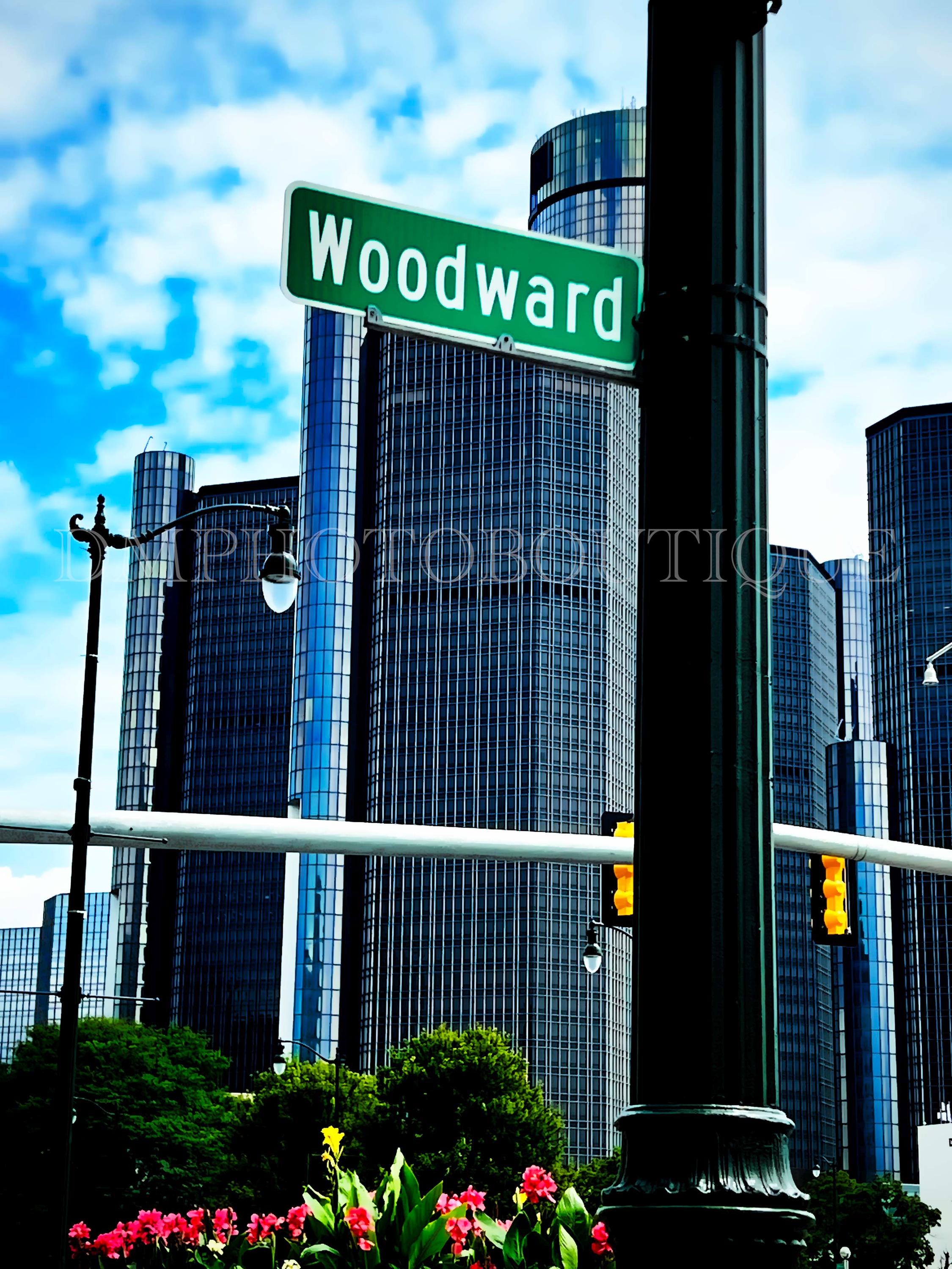 The iconic Woodward Avenue sign captured in front of the Renaissance Center in Detroit, Michigan.