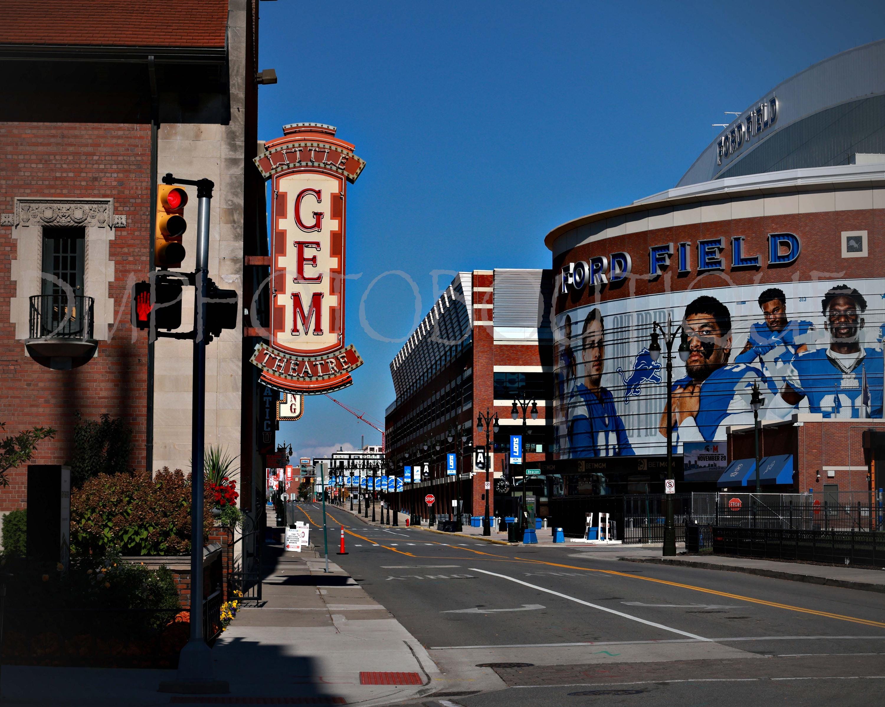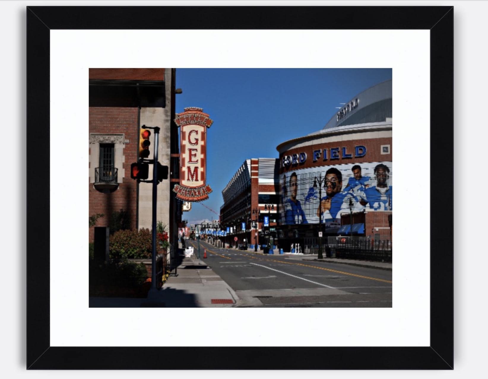 Level up your home decor with this awesome image of the iconic Gem Theater and Ford Field.