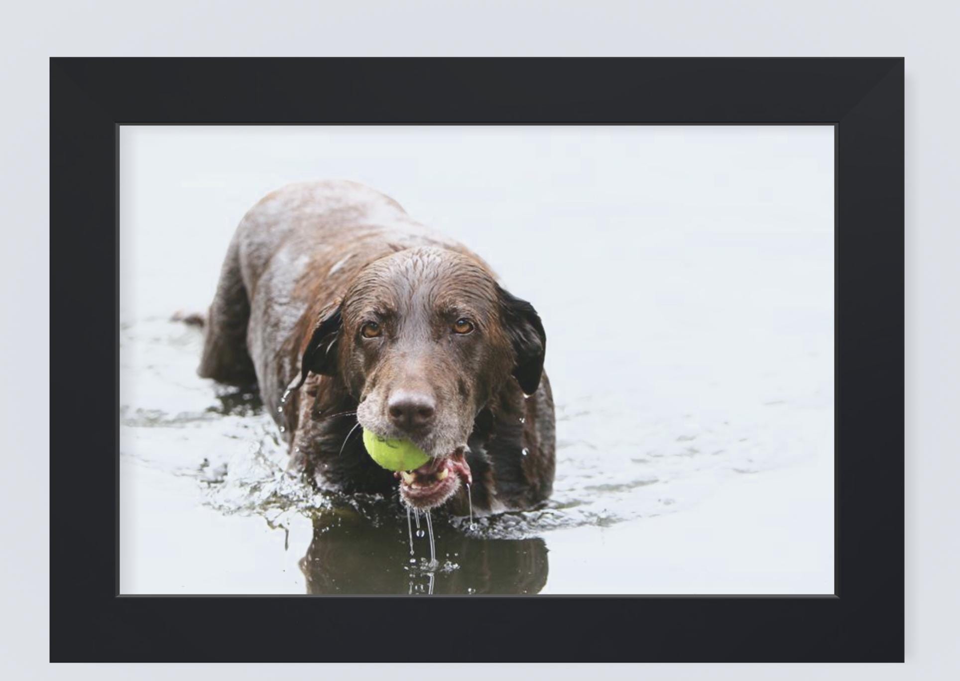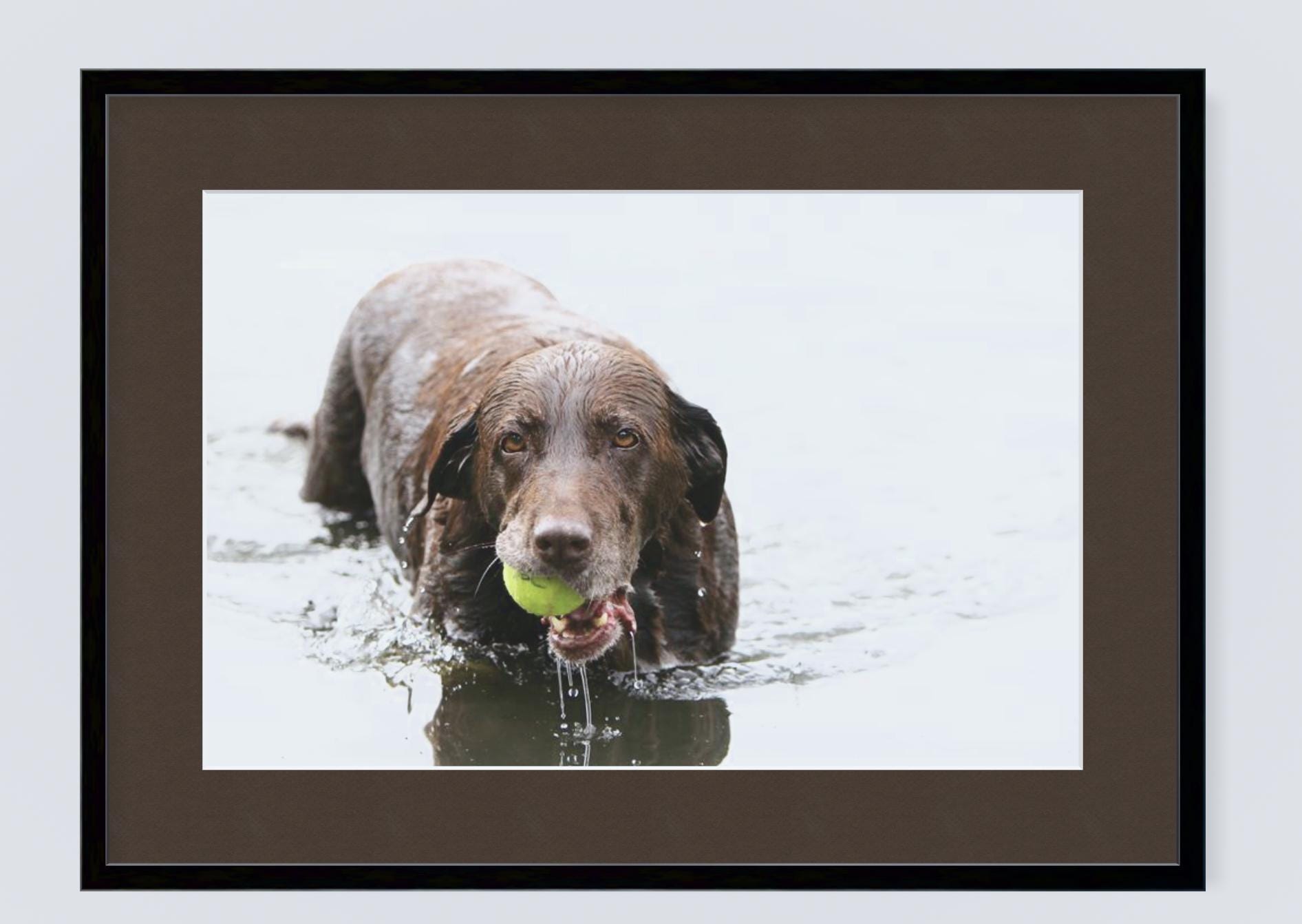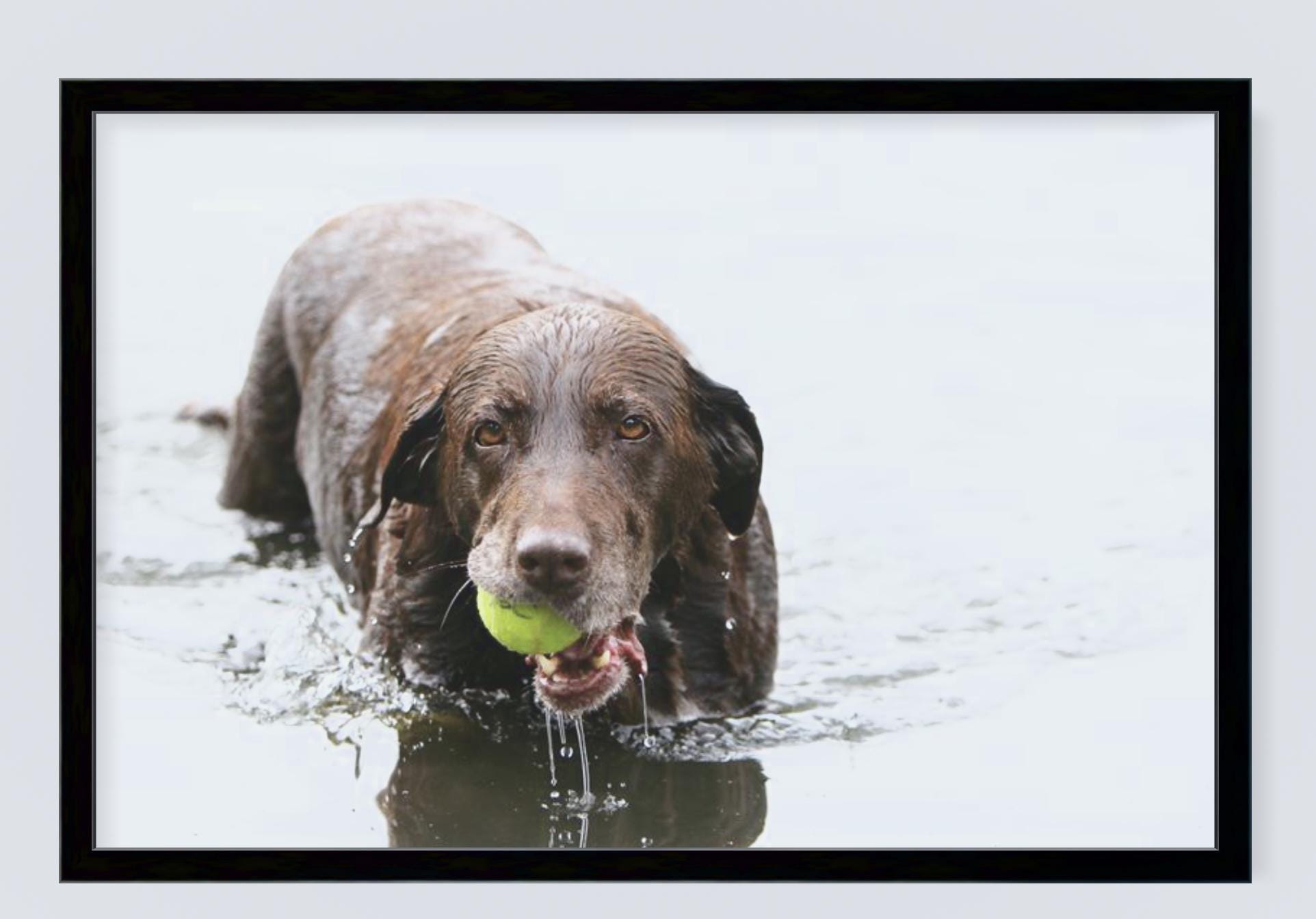 A beautiful, natural shot of a chocolate lab doing what they love best! This makes a great gift for the lab lover!