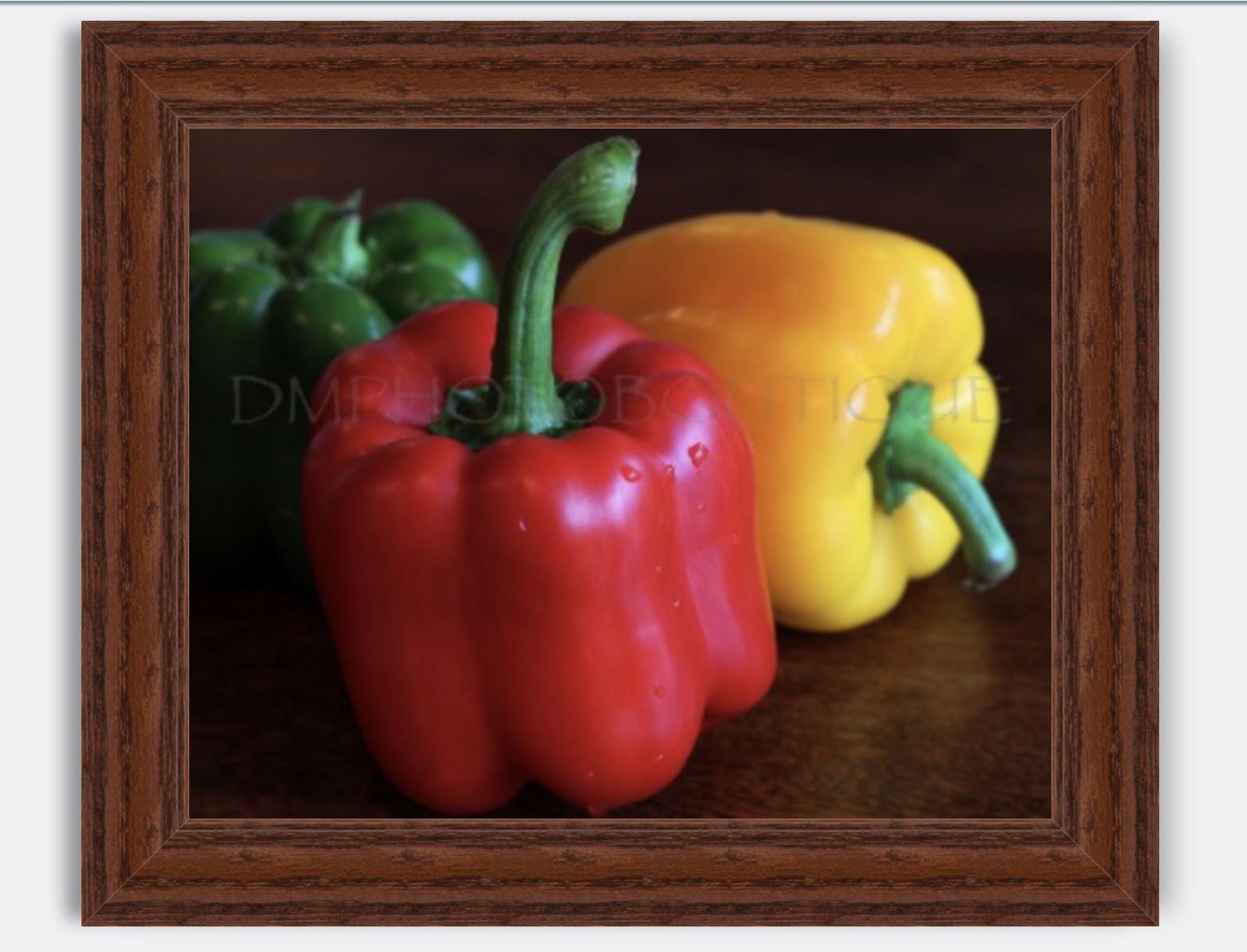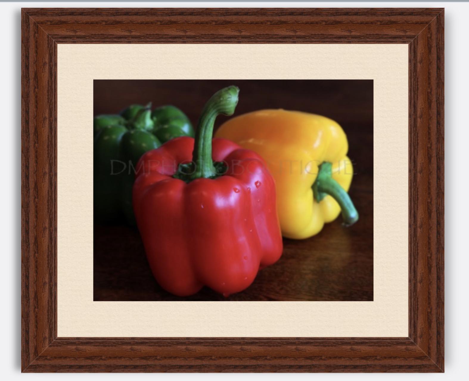A brightly colored still life of a variety of peppers with water droplets. Perfect for your kitchen decor!