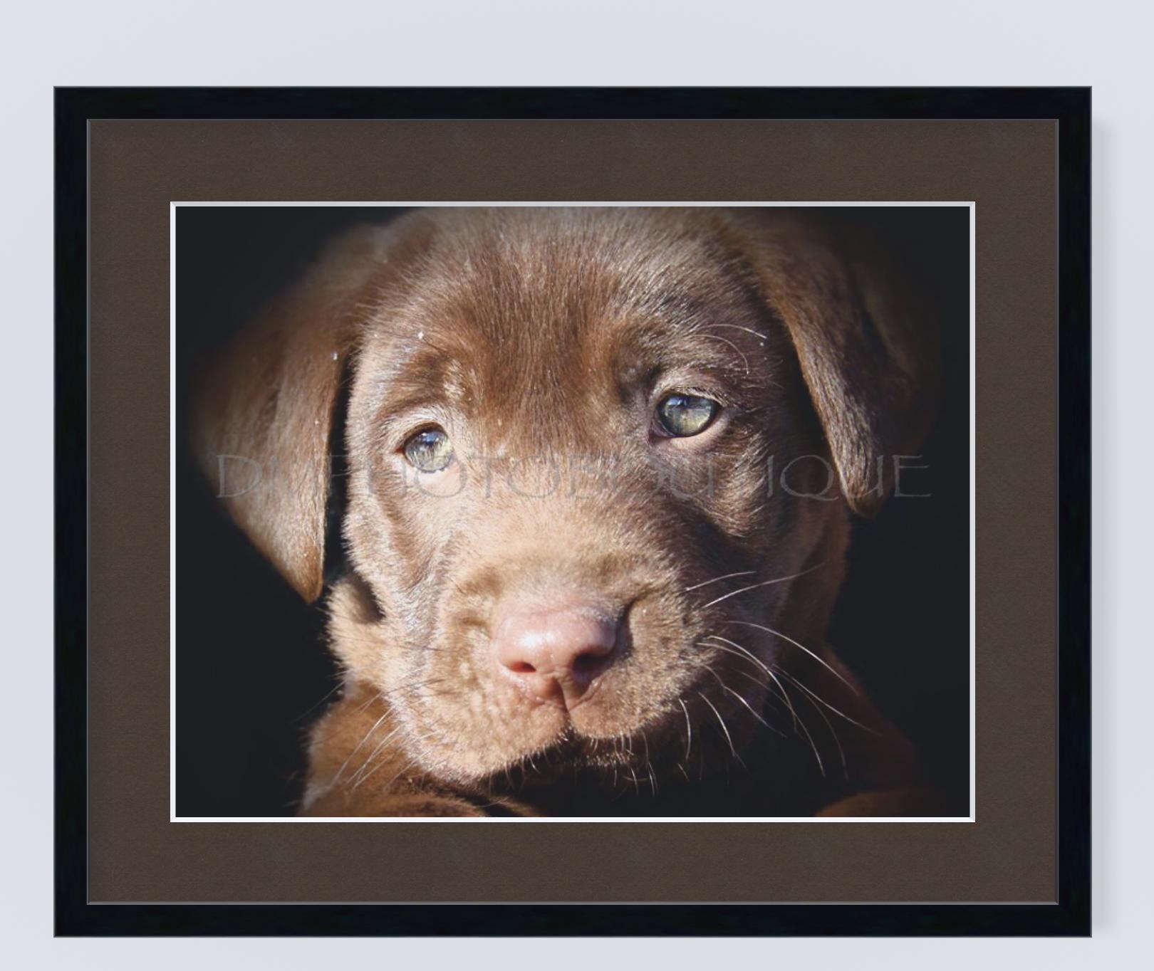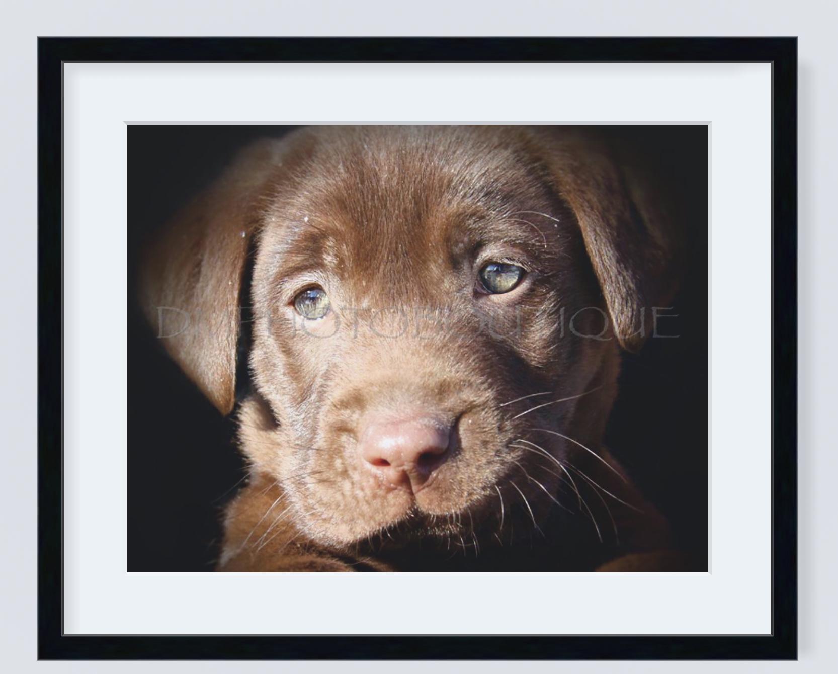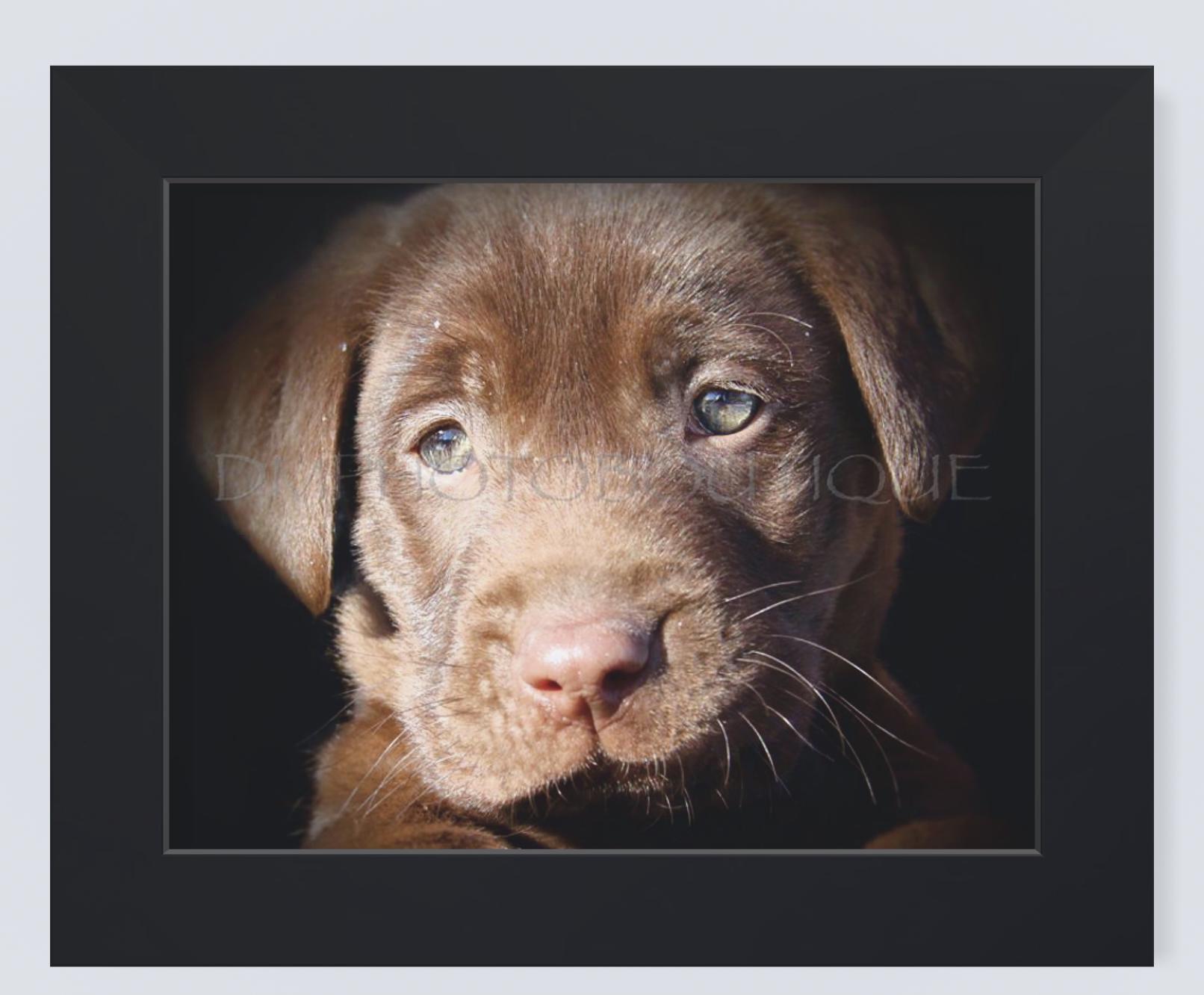 The cutest chocolate lab puppy capturing his sweet face and gentle eyes.