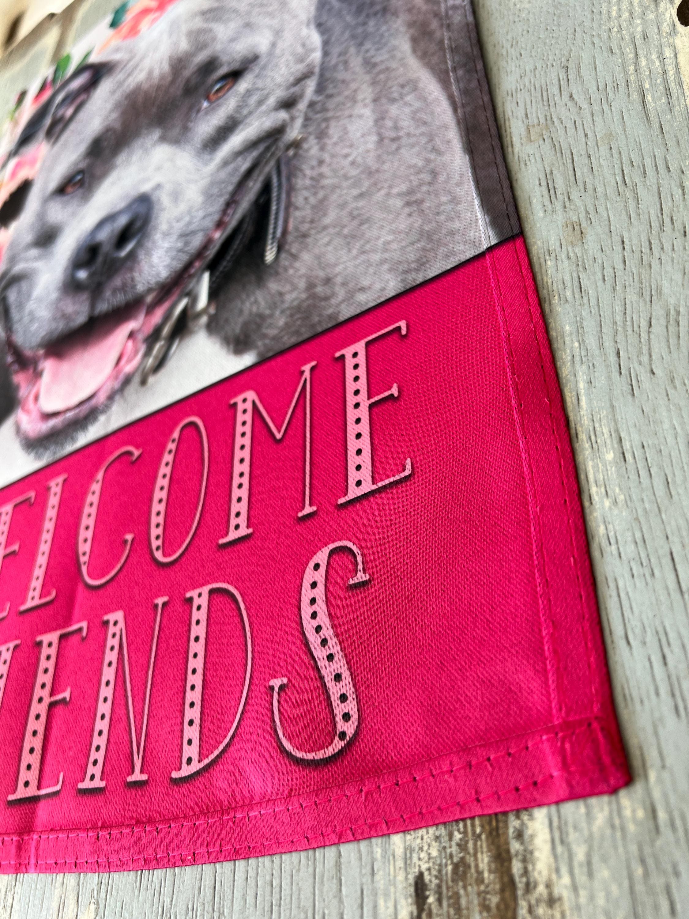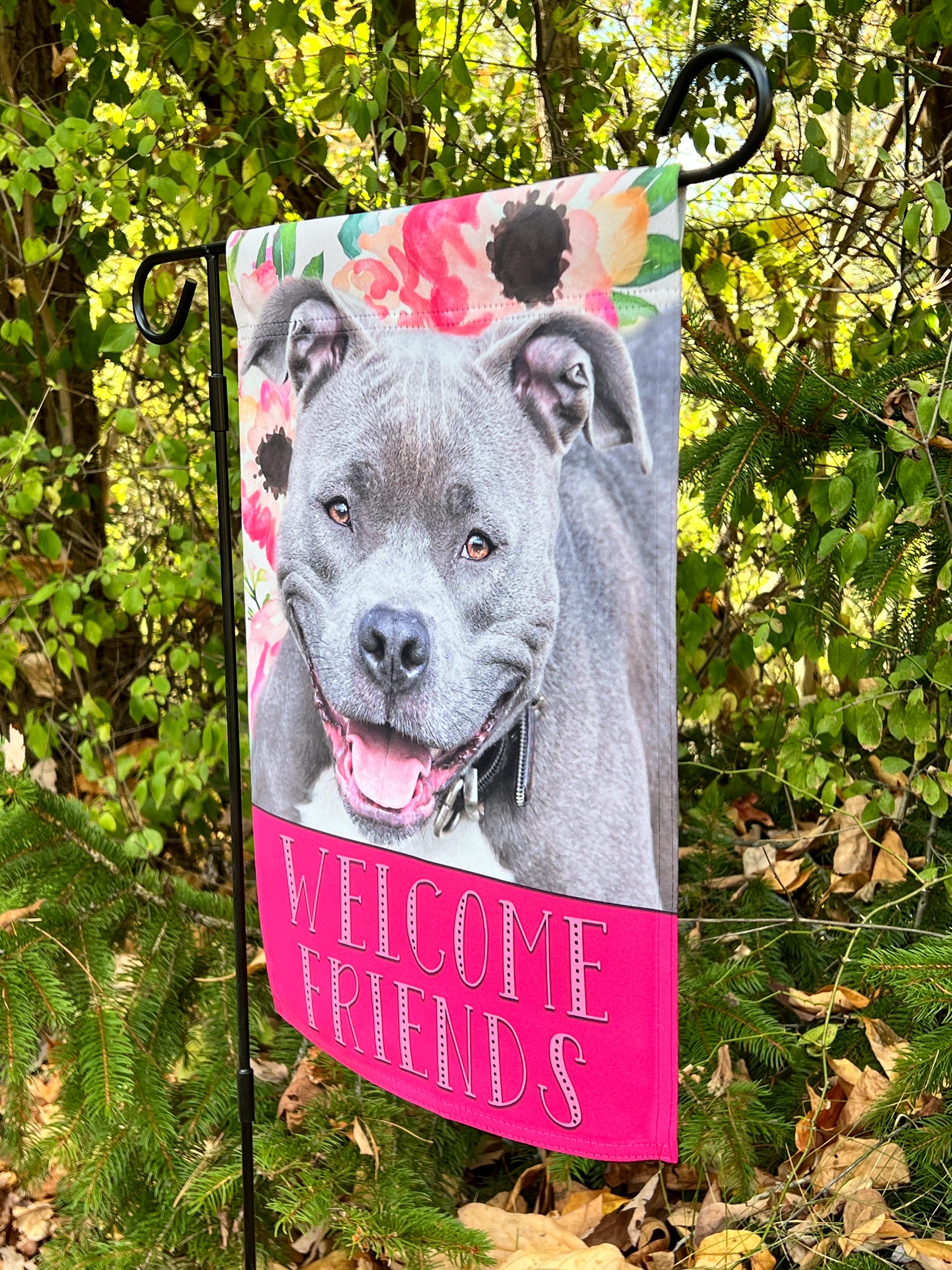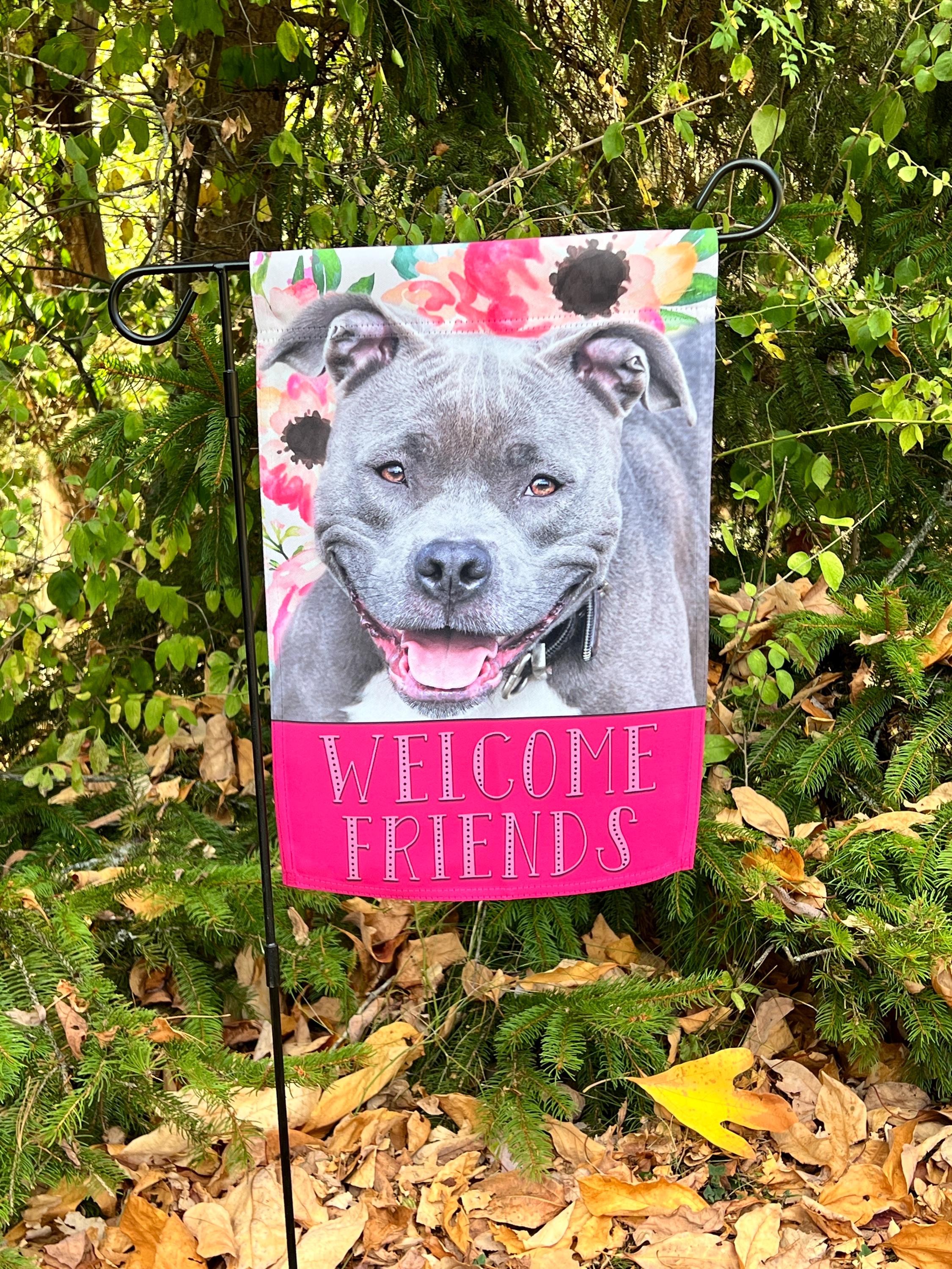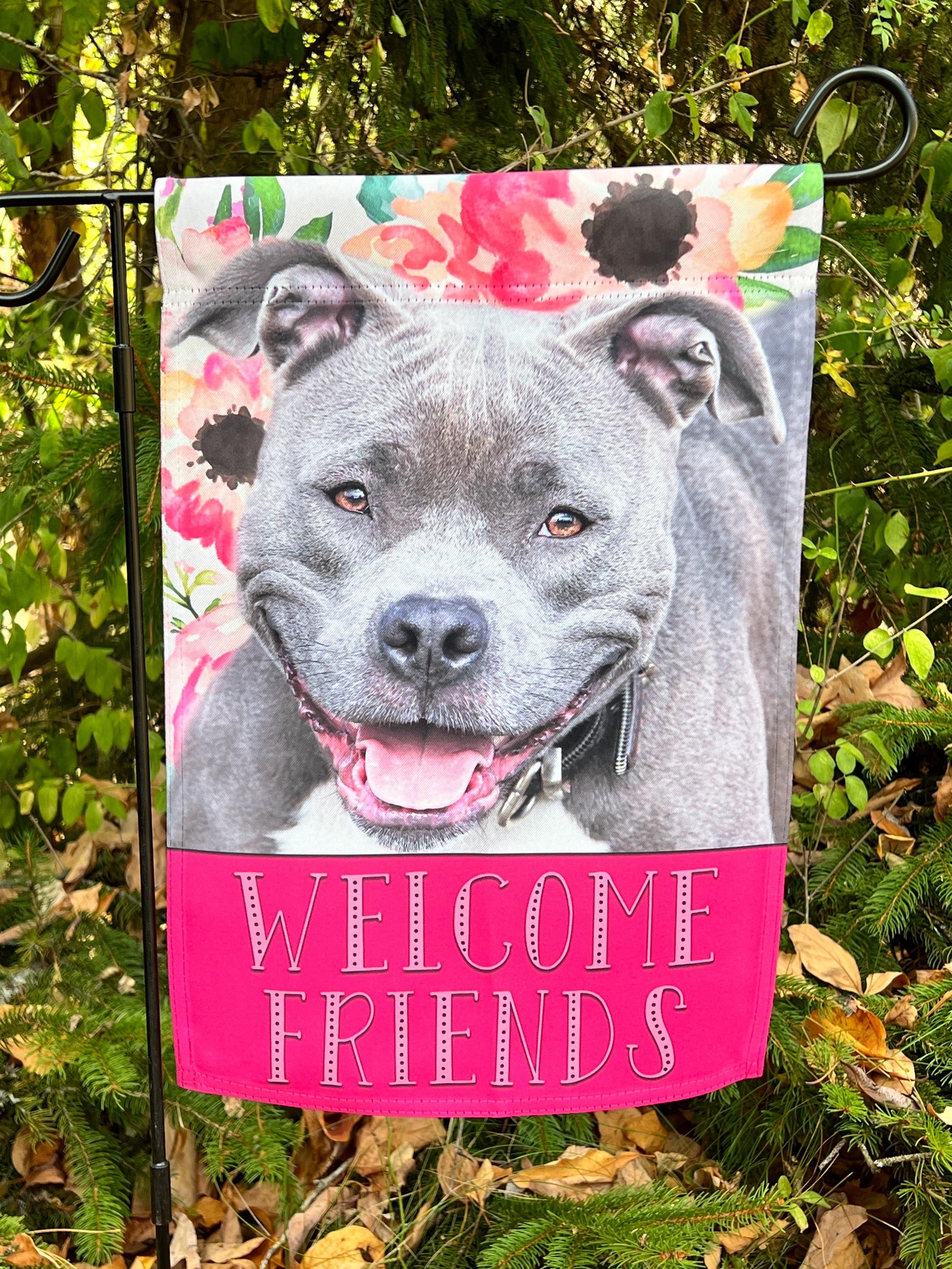 Welcome friends to your home with this smiling pitbull garden flag. Great gift for the dog lover, groomer or dog sitter.